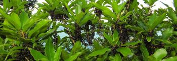 The bell shaped hanging flowers are small and yellow, but fragrant. The fruit that follows are white blotched with purple or blueblack and often having the white on the underside of the fruit. possibly an adaption to attract geckos and skinks..