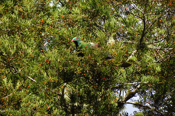 A very popular garden tree. Handsome, tall and erect, the kahikatea is one of New Zealands tallest trees. Once the dominant species of a distinct swamp forest type all but extinct in the North Island. Not Threatened, however as a forest-type it has been greatly reduced by logging. Growing up to 50-60 metre and with a trunk up to a 1metre. The trunk of young trees is undistinctive, but that of mature trees with the characteristic hammermarked pattern. Young trees has long, narrow and slightly curved leaves, almost fern looking. This juvenile foliage is until 1-2 metre of high. Adult trees have leaves that are short, overlapping, like fish scales. The cones are highly modified swelling at maturity into an orange to red, fleshy fruit with a single black seed. The seed is dispersed by native birds , mostly kereru that eat the seeds with the fleshy fruit, and pass the seeds in their droppings. A large mature can produce up to136 kg of seeds.