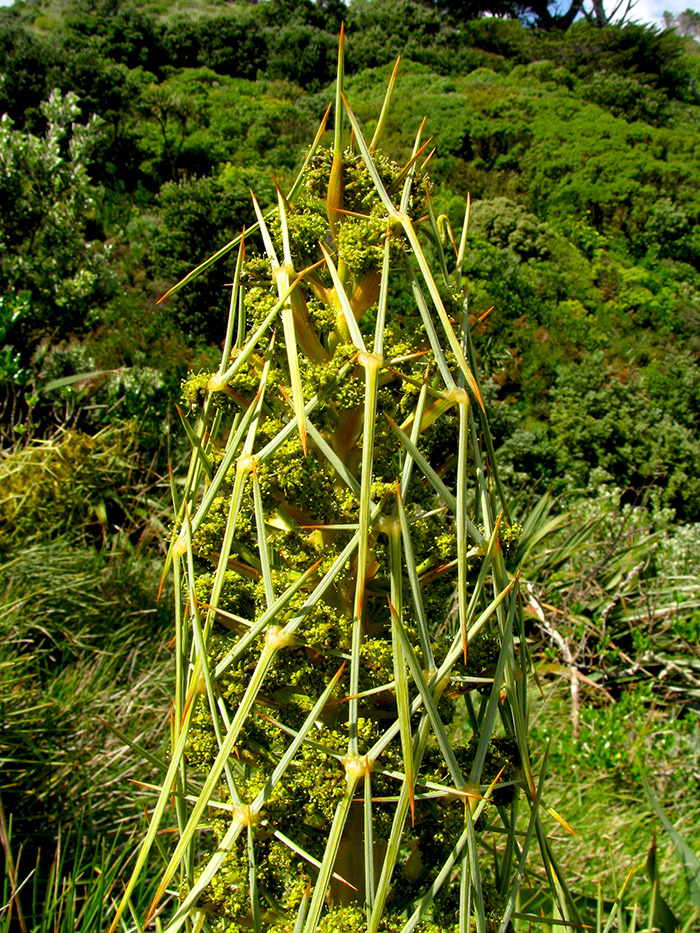 A near iconic species of New Zealand growing in coastal conditions. These attractive plants can grow int a large size and are covered with sharp narrow spines like leaves. These sharp spines, are all pointing out from the centre of the plant that can sometimes grow up to 90 cm wide. Flowers are yellow and attached to a large spine covered head rising above the rest of the plant up to 1 metre.